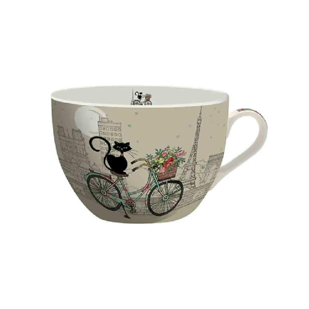 Bol en porcelaine fine avec anse, décoré d’un chat à vélo et de la Tour Eiffel. Idéal pour les amoureux des chats et de Paris. Compatible lave-vaisselle et micro-ondes, ce bol est parfait pour le petit-déjeuner ou comme idée cadeau.